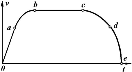 Участок Оа – происходит разгон с постоянным по величине ускорением a= const; участок ab – сила тяги уменьшается; участок графика bc – движение равномерное, fM = const; при выключенном тяговом двигателе мотовоз двигается по инерции – участок cd; на участке de – движение происходит в тормозном режиме до остановки.