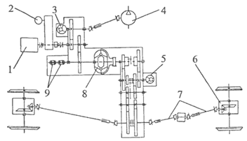 1 – дизель; 2 – генератор; 3 – импульсный насос; 4 – компрессор; 5 – импульсный насос; 6 – осевой редуктор; 7 – карданные передачи; 8 – гидромеханическая передача; 9 – блок питающего и отсасывающего насосов.