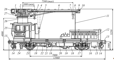 1 – тяговая лебедка; 2 – привод поворота стрелы; 3 –грузовая тележка; 4, 7 – крайние положения крюковой обоймы; 5 – транспортное положение крюковой обоймы; 6 – стрела крана; 8 – поводок; 9 – обводной блок; 10 – ограничитель грузоподъемности; 11 – транспортные распорки; 12 – дизель-генератор; 13 – автосцепки; 14 – катушки КЛУБ-УП; 15 – топливный бак; 16 – песочница; 17, 23 – приводные колесные пары; 18 – карданные валы; 19 – универсальная гидропередача ГП-300; 20 – платформа; 21 – промежуточная опора; 22 – пневмосистема; 24 – аутригеры; 25 – кабина управления; 26 – промежуточная опора крана; 27 – основание крана; 28 – грузовая лебедка.