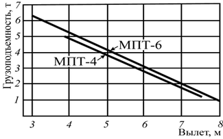Аутригеры приводятся гидроцилиндрами 2, а их выдвижная часть фиксируется пальцем 5. Зависимость грузоподъемности крана от вылета для мотовозов МПТ-4 и для сравнения МПТ-6 показана на рисунке 2.2.