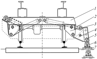 1 – балка; 2 – гидроцилиндр опорный; 3 – кронштейн; 4 – аутригер; 5 – палец; 6 – башмак; 7 – подкладка.