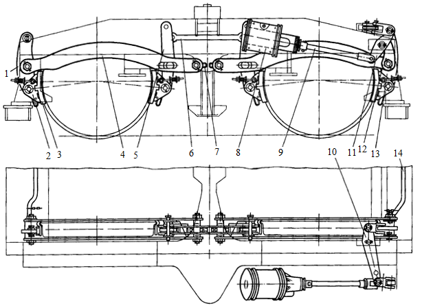 Рисунок 1.4 – Схема рычажной передачи тепловоза ТЭМ-7: 1, 7, 13 – опора; 2 – держатель; 3 – тормозная колодка; 4, 12 – балансир; 5 – обод колеса; 6 – тяга; 8 – тормозной цилиндр; 9 – шток; 10, 11 – рычаг