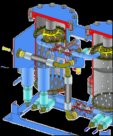 Подлежащий осушке сжатый воздух поступает от источника сжатого воздуха и попадает в предварительный фильтрующий блок. Блок состоит из влагомаслоотделителя циклонного типа и предварительного фильтра. Данный блок отделяет от сжатого воздуха конденсат, аэрозоль масла и частицы грязи. Примеси накапливаются в стаканах-отстойниках и сбрасываются под давлением в момент открытия электромагнитных клапанов.