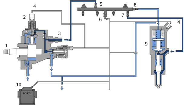 1 – топливный насос высокого давления; 2 – клапан отключения плунжерной секции; 3 – клапан регулирования давления; 4 – магистраль высокого давления; 5 – аккумулятор высокого давления; 6 – датчик давления топлива в аккумуляторе; 7 – клапан ограничения давления; 8 – ограничитель пропускной способности; 9 – форсунка; 10 – блок управления