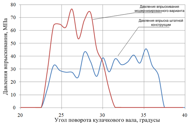Рисунок 4.12 – Характеристика давления впрыска топлива штатного и модернизированного варианта