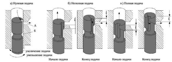 Вертикальный паз соединяет надплунжерное пространство с кольцевой выточкой, при этом топливо заполняет не только надплунжерное пространство, но и вертикальный паз, и кольцевую выточку. Если повернуть плунжер так, чтобы вертикальный паз расположился прямо против окна А в гильзе, то при движении плунжера вверх топливо будет вытекать через окно А и не попадет в нагнетательный трубопровод. Для осуществления частичной подачи топлива плунжер поворачивают вокруг оси по часовой стрелке так, чтобы окно А было изолировано от вертикального паза (рисунок 1.2, б). Топливо из надплунжерного пространства будет поступать в нагнетательный топливопровод только до момента, когда кромка О не откроет окно А. Плунжер при этом поднимается на величину h1, объем вытесненного в цилиндр топлива будет равен площади поперечного сечения плунжера, умноженной на расстояние h1. Дальнейшее движение плунжера вверх происходит вхолостую, так как вытесняемое топливо вытекает через окно А.