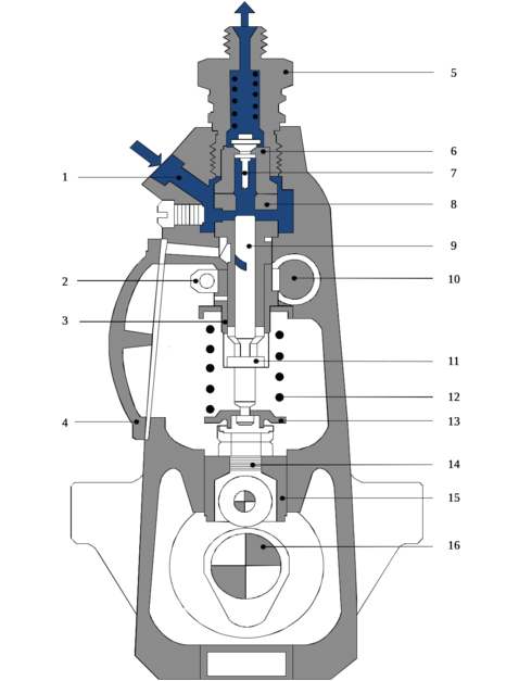 1 – полость всасывания; 2 – зубчатый сектор; 3 – регулирующая втулка плунжера; 4 – боковая крышка; 5 – штуцер нагнетательного клапана; 6 – корпус нагнетательного клапана; 7 – конус нагнетательного клапана; 8 – гильза плунжера; 9 – плунжер; 10 – рейка топливного насоса высокого давления; 11 – поводок плунжера; 12 – возвратная пружина плунжера; 13 – нижняя тарелка возвратной пружины; 14 – регулирующий винт; 15 – роликовый толкатель; 16 – кулачковый вал.