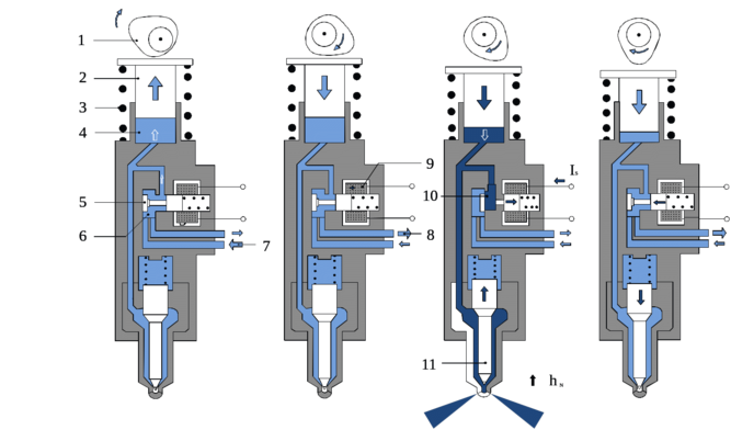 Для того чтобы могло произойти впрыскивание топлива, блок управления работой дизеля включает катушку электромагнита в то время, когда плунжер движется вверх. Пока катушка под напряжением, клапан остается закрытым и топливо под давлением подается к распылителю. Одновременно снижается сила тока в катушке электромагнита, удерживающей клапан в закрытом положении. Соответственно, уменьшаются потери мощности и излишнее тепловыделение, связанные с прохождением тока через катушку. Для окончания впрыскивания блок управления снимает напряжение с катушки. Возвратная пружина клапана сдвигает управляющий поршень в открытое положение. Оставшееся горючее, нагнетаемое плунжером, перетекает через открытый клапан в канал обратного слива топлива. Таким образом, магистраль высокого давления разгружается до давления в системе подачи.