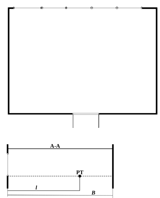Рисунок 4.1 – Схема ремонта дизелей депо Уссурийск, обозначение размеров для расчета бокового освещения: Lш – ширина помещения, соответствует10 м; l – расстояние от противоположной световым приемам стены до расчетной точки (РТ), равна 7 м, B – глубина помещения, равна 9 м; L – длина помещения, равна 30 м.