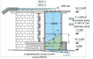 Емкости промежуточного склада расположены над выжимным помещением ПТОЛ, и песок самотеком поступает в шесть выжимных баков. Каждый выжимной бак снабжает два последовательно соединенных раздаточных бункера на крыше ПТОЛ, давлением 4,0–6,0 кгс/см2.