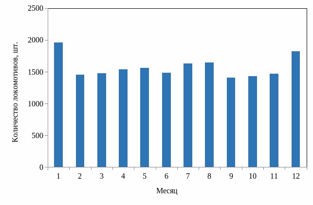 На рисунке 3.4 изображен график, на котором годовой объем локомотивовпрошедшиеТО-2 за 2015год разбит помесячно.