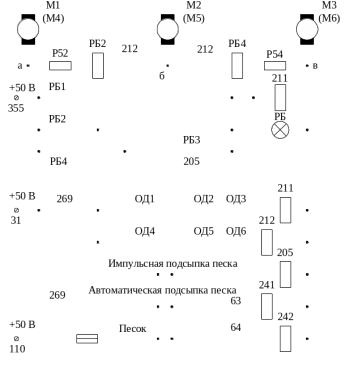 Принцип действия одной из самых ранних систем борьбы с боксованием заключается в следующем. В каждой группе из трёх тяговых двигателей М1 (М4) – МЗ (М6) между якорями и обмотками возбуждения включены реле боксования РБ1 (РБЗ) и РБ2 (РБ4), добавочные резисторы Р51 (Р52) и Р53 (Р54) и контакторы реле времени 211(212). При отсутствии боксования колёсных пар, катушки реле РБ1 и РБ2 не возбуждены, в связи с тем, что они подключены к однопотенциальным точкам «а», «б» и «в» цепи. При боксовании ток в цепи двигателя боксующей колёсной пары уменьшится и в точках «а», «б» или «б», «в» появится разность потенциалов, в результате чего реле сработают и создадут цепь питания реле 269. Последнее замкнёт свои контакты в цепи возбуждения вентиля подачи песка и одновременно разорвёт цепь катушек реле времени 211 и 212, которые через 1–1,5 секунды сработают и разорвут цепь катушек реле боксования, тем самым подача песка прекратится. Однако если боксование не прекратилось, реле снова сработают, и подача песка возобновится.
