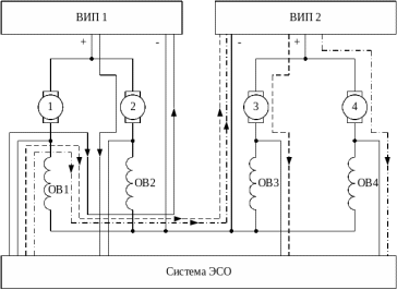 - контур первый (сплошная линия): плюс выпрямительно-инверторного преобразователя №1 (ВИП-1) – якорь двигателя №2 – система ЭСО – обмотка возбуждения двигателя №1 (ОВ-1) – минус ВИП-1;