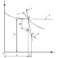 В точке К показан режим стабильной реализации силы сцепления. Если, например, из-за дождя произойдёт потеря сцепления на величину ΔF, то возникнет боксование колёсной пары (точка М), из-за превышения силой тяги силы сцепления. Скорость движения боксующей колёсной пары равна сумме скоростей vк поступательного движения и скорости скольжения u колеса по рельсу. При боксовании сила сцепления снижается по кривой 4. При мягкой тяговой характеристике (кривая 2) боксование будет стремиться развиваться в разносное, так как по мере увеличения скорости скольжения разность между силой тяги и силой сцепления будет возрастать. При жёсткой характеристике (кривая 1), сила сцепления при скорости, соответствующей точке N, окажется равной силе тяги. Таким образом скольжение колёсной пары прекратится и наступит новое равновесие.