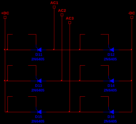 Подсхема VIP2 по своему составу аналогична VIP1. В качестве тиристоров Т353-800 выбраны максимально приближенные по параметрам тиристоры 2N6405, имеющие обозначения на схеме D11–D16. Система управления преобразователем реализована на базе источников импульсов PULSE_VOLTAGE, имеющих обозначение на схеме V100, V200, V300, V400, V500 и V600.