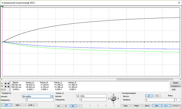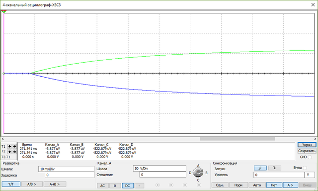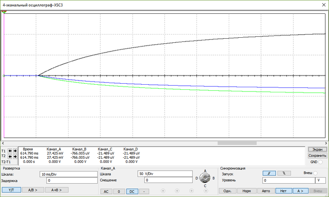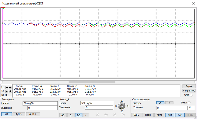 Из рисунка 3.8 видно, что в условиях равенства характеристик всех ТЭД разница потенциалов между средними точками почти отсутствует.