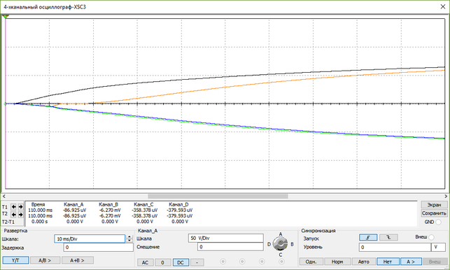 Графики токов тяговых электродвигателей снимаются с помощью элемента CURRENT_CONTROLLED_VOLTAGE_SOURCE. Токи якорей фиксируются датчиками V1–V4, а уравнительные токи – датчиками V01–V04 и передаются на осциллографы XSC1 и XSC3 соответственно.