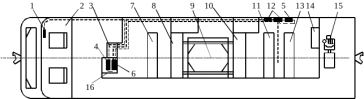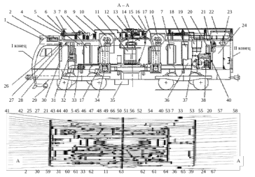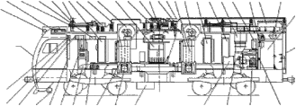 1 – Блок управления системой ЭСО; 2 – Кабина локомотива; 3 – Блок управления БУ-193; 4 – IGBT-модуль с радиатором; 5 – Сглаживающий дроссель (ДР); 6 – Блоки диодов (БД1, БД2); 7 – Блок силовых аппаратов 1; 8 – Выпрямительно-инверторный преобразователь 1; 9 – Трансформатор; 10 – Выпрямительно-инверторный преобразователь 2; 11 – Блок силовых аппаратов 2; 12 – Автоматический быстродействующий выключатель; 13 – Блок 8; 14 – Блок ВУВ-24; 15 – Блок мотор-компрессора с пневматическим оборудованием; 16 – Блок питания и коммутации