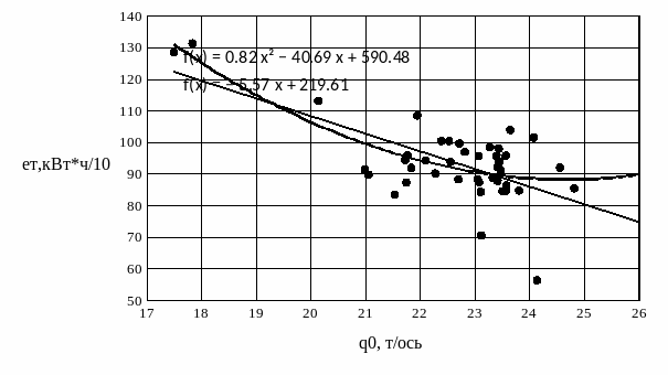 Весь исследуемый массив данных о поездках, взятый из маршрутных листов машиниста разделим на группы поездов со средней массой, приходящейся на ось вагона: 15 – 20 т/ось и 20 – 23 т/ось. Для каждой группы методом наименьших квадратов получено выражение вида
