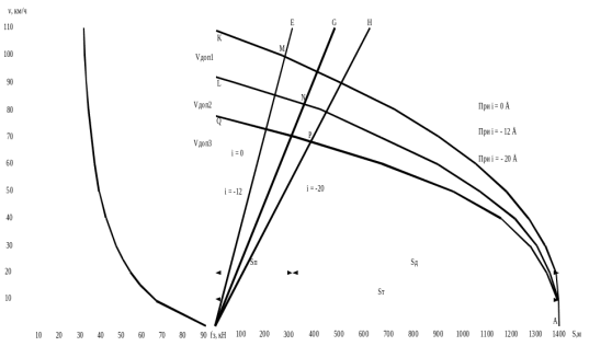 Построение кривых производится, начиная с конца тормозного пути, так как скорость начала торможения неизвестна. Затем для каждого спуска и произвольно выбранной скорости начала торможения, принимается