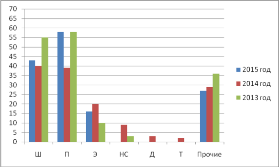 Из графика видно, что за период с 2013 по 2015 года наибольшее количество отказов допустили два хозяйства, Ш и П. В целом ситуация по отказам во всех службах неустойчива.