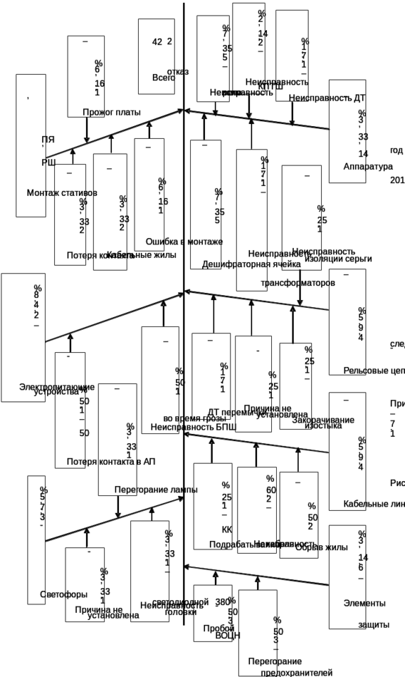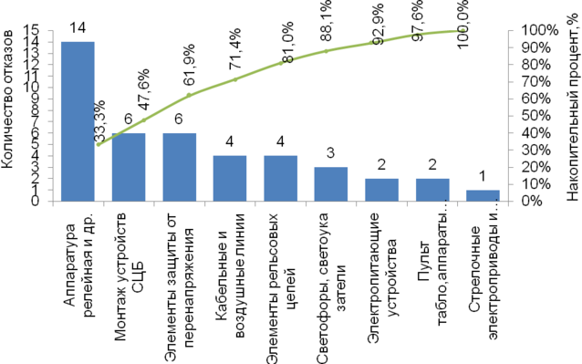 При рассмотрении случаев нарушения нормальной работы устройств СЦБ за 2015 год (рисунок 1.4) по отдельным объектам установлено, что наибольшее количество отказов допущено из-за неисправностей в релейной и бесконтактной аппаратуре (33,3%); при монтаже устройств СЦБ (14,3%); в элементах защиты от перенапряжения (14,3%); в кабельных и воздушных линиях (9,5%), в элементах рельсовых цепей (9,5%).