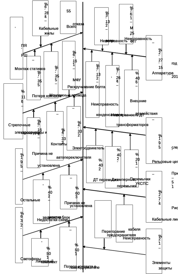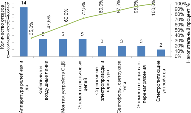 При рассмотрении случаев нарушения нормальной работы устройств СЦБ за 2014 год (рисунок 1.3) по отдельным объектам установлено, что наибольшее количество отказов допущено из-за неисправностей в релейной и бесконтактной аппаратуре (35%); в кабельных и воздушных линиях (12,5%), при монтаже устройств СЦБ (12,5%); в элементах рельсовых цепей (12,5%);в стрелочных электроприводах и гарнитурах (7,5%).