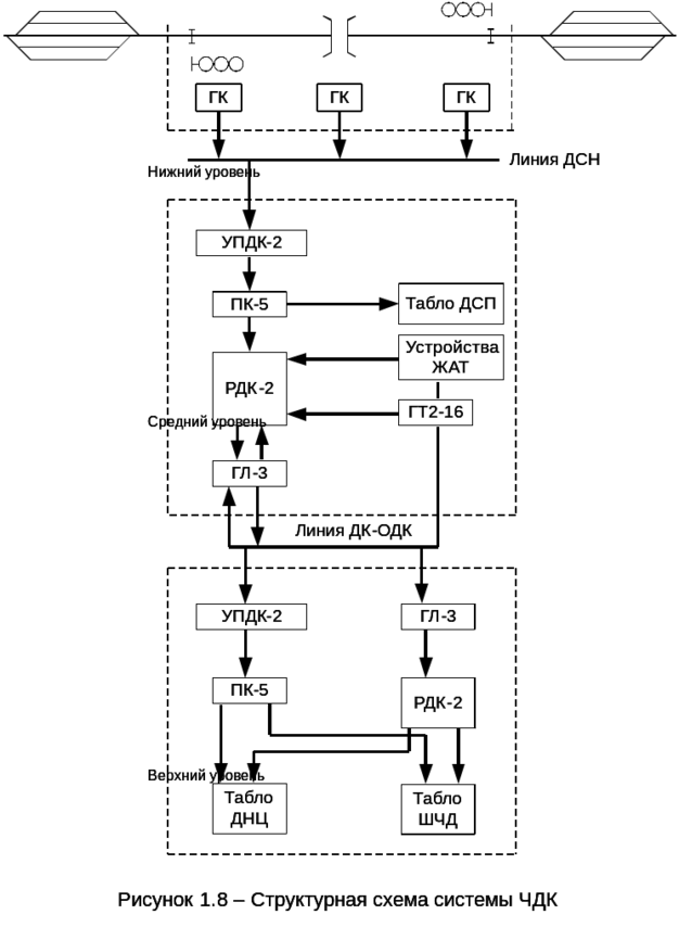 Система АПК-ДК состоит из трёх уровней (лист 2 графического материала работы) – нижнего, среднего и верхнего, структурная схема представлена на рисунке 1.9. Она реализуется с использованием программируемых контроллеров, персональных компьютеров и специального программного обеспечения (ПО). Автоматизированные рабочие места пользователей (АРМ), аппаратура СЖАТ, с помощью каналов связи, объединены между собой и образуют единую вычислительную сеть.