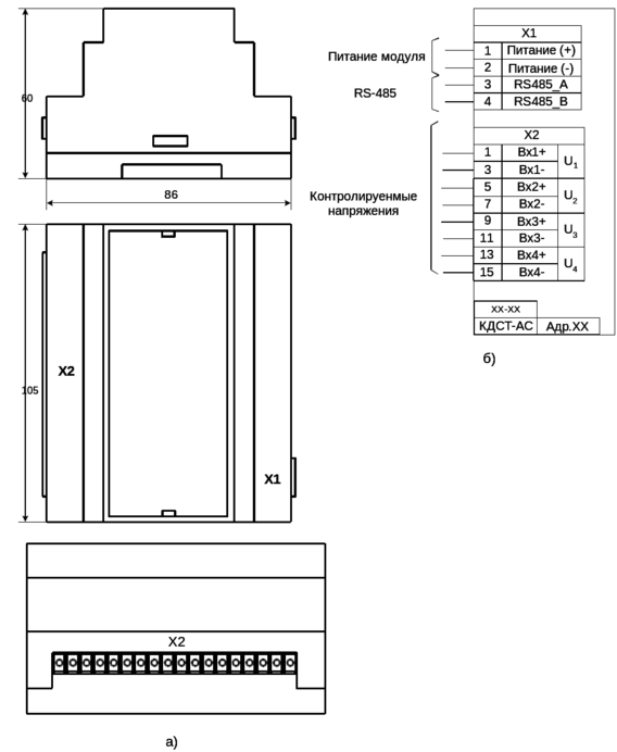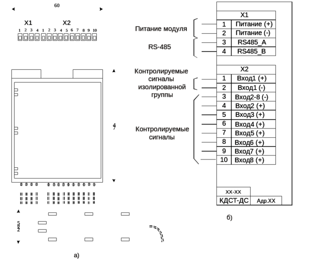 Рисунок 2.3 – а) внешний вид контроллера КДСТ-ДС; б) принципиальная схема соединителей КДСТ-ДС