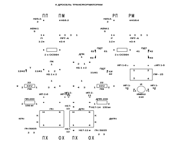 На сигнальной установке имеются блоки БИ (блок исключения), БС (блок счетчиков), БК (блок конденсаторов) дешифратора типа ДА; И - импульсное путевое реле; Т - трансмиттерное реле; Ж, З - сигнальные реле; Ж1, Ж2, Ж3 - повторители реле; О - огневое реле; ОД - дополнительное огневое реле; ОИ - обратный повторитель импульсного реле; КПТ (КПТШ) - кодовый путевой трансмиттер; ПЧ - преобразователь частоты; ДСН - реле двойного снижения напряжения; Н - реле направления; ИП - известительное реле приближения; ИП1 - повторитель известительного реле приближения; ДТ - дополнительное трансмиттерное реле; ПДТ - реле включения ДТ. Состояние цепей схемы соответствует одностороннему движению поездов в правильном направлении.