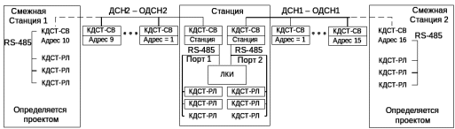 Двухлучевая конфигурация с разделением лучей на станции приведена на рисунке 2.4. Эта конфигурация является расширением однолучевой конфигурации организации связи. Для обеспечения связи с прилегающими перегонами на станции устанавливается отдельный концентратор связи КДСТ‑СВ на каждый перегон. На ЛКИ используется отдельные порты интерфейса RS‑485 для связи с КДСТ‑СВ каждого луча. Нумерация адресов в пределах каждого луча производится так же, как и в случае однолучевой конфигурации.