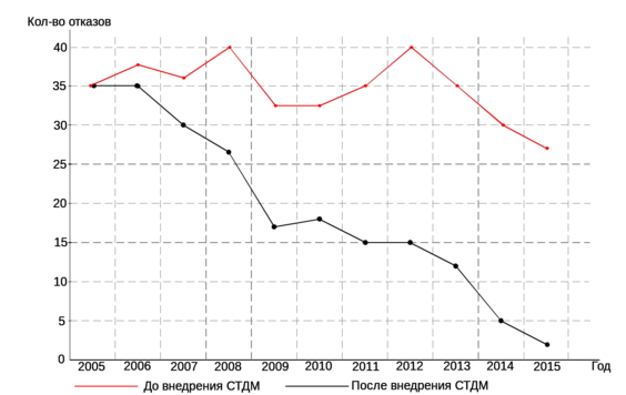 КО1 ‒ количество отказов с внедрённой СДТМ;