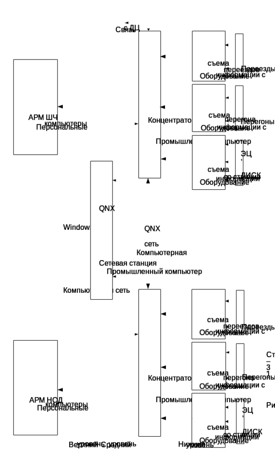 Нижний уровень составляет линейное перегонное оборудование, выполненное в виде функциональных контроллеров КДСТ-ДС, КДСТ-АС, КДСТ-ФД и концентратора связи КДСТ-СВ, обеспечивающих выполнение следующих функций: сбор дискретной информации о состоянии блок-участка (выполняется КДСТ-ДС); измерение временных характеристик работы кодовой аппаратуры (выполняется КДСТ-ДС); измерение напряжений в контрольных точках сигнальной установки и переезда (выполняется КДСТ-АС); измерение напряжений на основном и резервном фидерах питания (выполняется КДСТ-ФД); обнаружение отклонений измеряемых параметров от установленных норм и формирование диагностической информации о неисправностях (выполняется КДСТ-ДС, КДСТ-АС, КДСТ-ФД); передача полученной диагностической информации о сигнальной точке и результатов измерений на станцию (выполняется КДСТ-СВ). КДСТ перегонного уровня системы устанавливаются в релейных шкафах переездной сигнализации (РШ АПС) и/или релейных шкафах сигнальных точек (РШ СТ). Передача информации на второй станционный уровень осуществляется по линии ДСН или по выделенной физической симметричной линии связи (одна витая пара в медном кабеле связи с сечением жилы не менее 0,8 мм2). Второй уровень - это станционное оборудование, которое представляет собой концентратор связи с сигнальными точками КДСТ-СВ, контроллер КДСТ-РЛ, управляющий лампами пульта-табло ДСП, линейный концентратор информации ЛКИ и рабочее место в виде АРМа ШН. Связь ЛКИ с концентратором связи КДСТ-СВ и контроллером КДСТ-РЛ осуществляется по стандартному интерфейсу RS-485. Связь между ЛКИ и АРМ ШН осуществляется по интерфейсу Ethernet.