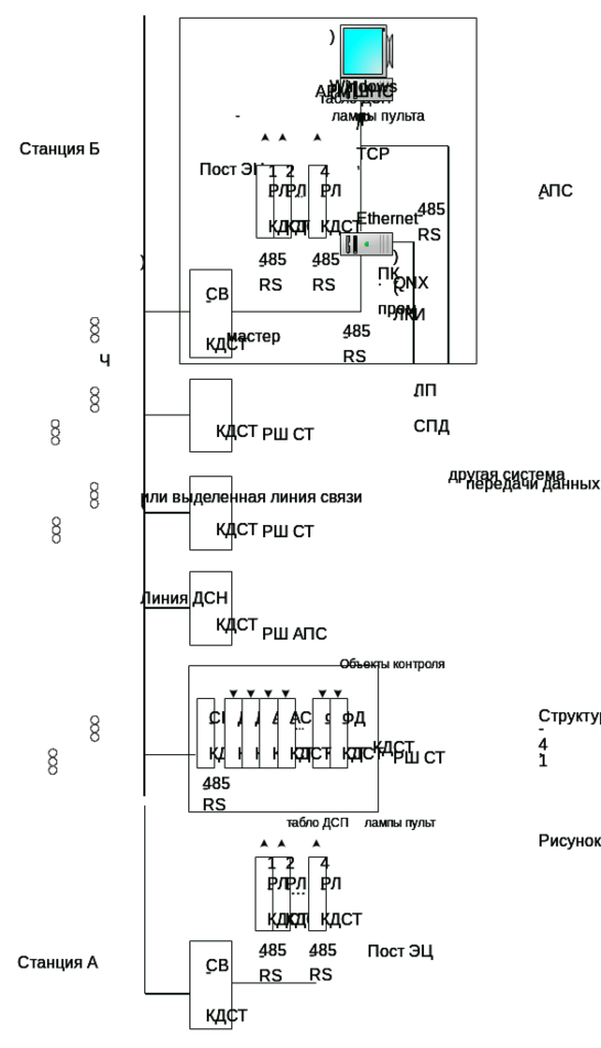 Данный уровень обеспечивает выполнение следующих функций: прием диагностической информации о сигнальных точках и результатов измерений от перегонного оборудования; отображение информации о занятости блок-участков и состоянии переездов на пульт-табло ДСП; выполнение диагностических алгоритмов по обработке результатов измерений; запрос измеренных значений параметров сигнальной точки; сохранение информации и ее отображение на видеомониторе; передача диагностической информации о сигнальных точках и результатов измерений на вышестоящие уровни. Если ДСП смежной станции (например, станции «Б» на рисунке 1.4) необходимо на пульт-табло наблюдать занятость блок-участков всего перегона между станциями, то на этой станции дополнительно устанавливается комплект станционного оборудования для управления лампами пульта-табло ДСП, состоящий из концентратора связи с сигнальными точками КДСТ-СВ и контроллеров КДСТ-РЛ. В этом случае линия ДСН (или выделенная линия связи) должна быть выведена на смежную станцию (станцию «Б» на рисунке 1.4). Вышестоящим уровнем для ЛПД СДТС-АПС являются системы уровня дистанции сигнализации и связи: АРМ-ШЧД, АРМ-ТДМ, АСУ-Ш. К таким системам относятся СПД ЛП на базе КИ-6М, АДК-СЦБ или АПК-ДК. Передача информации от ЛКИ к этим системам возможна при подключении ЛКИ к СПД ЛП на базе КИ-6М по интерфейсу RS-422. Для передачи информации в центр контроля также возможно использование систем передачи данных с IP маршрутизацией по интерфейсу Ethernet.