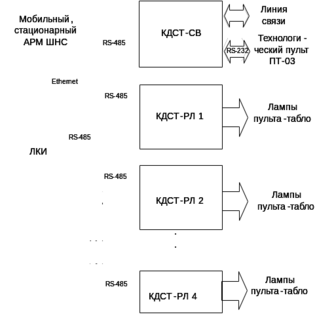 Для управления лампами пульта‑табло ДСП на смежной станции устанавливается комплект из концентратора КДСТ‑СВ и контроллеров КДСТ‑РЛ. Между концентратором КДСТ‑СВ и контроллерами КДСТ‑РЛ организуется локальная сеть на основе интерфейса RS‑485. Для КДСТ‑СВ устанавливается перегонный режим работы, производится назначение адреса в перегонной сети и подключение к перегонной сети передачи данных. Для управления лампами пульта-табло смежной станции ЛКИ передает команду управления по перегонной сети передачи данных на КСДТ‑СВ смежной станции, а он в свою очередь ретранслирует эту команду контроллерам КСДТ‑РЛ, подключенным к локальной сети RS‑485 [4].