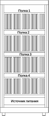 4 полки с электронными платами ОК и концентраторов, каждая из которых является типовым заводским изделием – рамой (конструктивом) со штепсельными разъёмами и направляющими для установки 23-х электронных плат контроллеров и концентраторов. Монтаж штепсельных разъёмов является типовым и выполняется заводом. На одной полке может быть установлено до 4-х ОК и один концентратор. На один концентратор можно подключить до 8-и контроллеров;