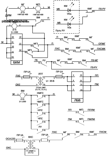 Для формирования мигающей сигнализации на входных светофорах служит схема комплекта мигания. При срабатывании реле мигающей сигнализации любого из светофоров возбуждается реле включения мигания ВМ (рисунок 2.8). Через фронтовой контакт этого реле по шине П-ВДИ запускается датчик импульсов ДИМ-1, расположенный в вводно-распределительном шкафу питающей установки или на стативе свободного монтажа. К выходу датчика импульсов по шине П-ДИ подключено реле мигания МГ и его повторитель МГ1. Аналогично датчик импульсов запускается при срабатывании реле пригласительного сигнала любого светофора, либо при переходе в режим РУ.