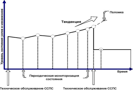 Периоды оценки уровня технического состояния узлов и механизмов привязаны к проведению ТО СПС, отслеживая технические параметры и их изменения, возможно, спрогнозировать (сформировать тенденцию) критическое состояние узла – поломку, что позволит более точно планировать ремонтные работы. Но основной целью и идеей данного метода является предупреждающее воздействие на объект контроля, с целью максимального сохранения узла или агрегата в работоспособном состоянии. Проведение ремонтных работ производится только тогда, когда это необходимо в связи с наступлением высокой вероятности отказа узла или механизма. Тем самым не нарушается работа исправного механизма из-за необоснованного вмешательства человека.