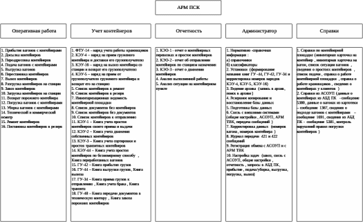В рамках АРМ ПСК реализованы следующие режимы работы: оперативная работа; учет контейнеров; отчетность; администратор; справки.