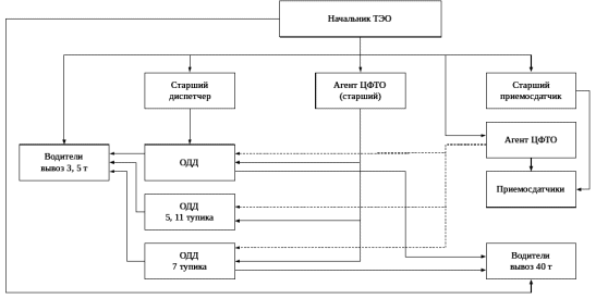 Для выполнения транспортно-экспедиторских услуг ТЭО имеет следующий штат: начальник ТЭО; старший диспетчер; операторы диспетчерского движения (ОДД); агенты ЦФТО по заказам населения на перевозки; водители автомобилей. Всего в распоряжении отдела ТЭО имеется 196 автомобилей, из них 55 автомобилей арендовано у МЧ-1 и 141 автомобиль арендован в грузовом автокомбинате. Заявку на дополнительный автотранспорт, по распоряжению начальника отдела ТЭО, производит старший диспетчер по автотранспорту.