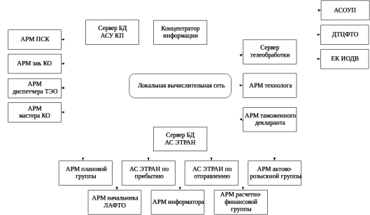 В настоящее время разработана автоматизированная система управления контейнерным отделением (АСУ КО) с использованием современных программно- технических комплексов. Структура АСУ КО (рис. 5.1) представляет собой локальную вычислительную сеть, объединяющую автоматизированные рабочие места (АРМ) работников контейнерного пункта и товарной конторы.