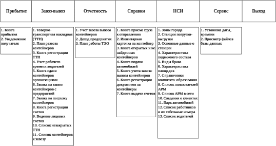 В АРМ ТЭО предусмотрено осуществление следующих режимов (рис. 5.2): прибытие; завоз и вывоз; отчетность; справки; НСИ; сервис; выход.