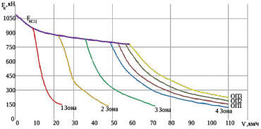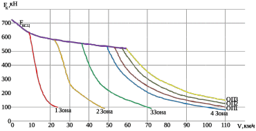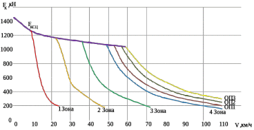 Расчетная скорость и сила тяги определяется в месте пересечения линии ограничения по сцеплению с линией зоны регулирования.