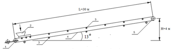 1 – натяжной барабан; 2 – загрузочное устройство;3 – роликоопоры;4 – лента; 5 – привод конвейера