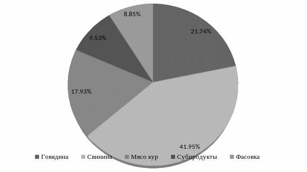 На диаграмме структуры по видам продукции видно, что больший удельный вес в общем объеме занимает продажа мясопродуктов из свинины 42% -2014 год, в 2015 немного увеличился удельный вес и составил 48%. Удельный вес говядины уменьшился в 2015 году на 2% и составил 20% от общего объема.