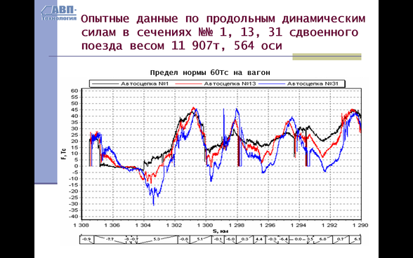 Рисунок 5.6 – Опытные данные по продольным динамическим силам в сечении: № 1, 13, 31 автосцепных устройств сдвоенного поезда весом 11907т, 564 оси.