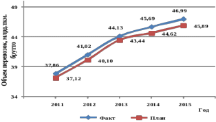 За 2015 год объем перевозок по эксплуатационному локомотивному депо Амурское составил 46,99 млрд. ткм. брутто или 102,8 % к плану, со снижением на 1,9 % к уровню прошлого года (факт 2014г – 47,92; план – 45,69). По итогам работы 4 квартала выполнение объема перевозок составило 12,542 млрд. ткм. брутто или 111,9 % к плану, и ростом к аналогичному периоду прошлого года на 5,7 %. Динамика роста объемов грузовых перевозок за период с 2011−2015 годы, представлена на рисунке 1.2.