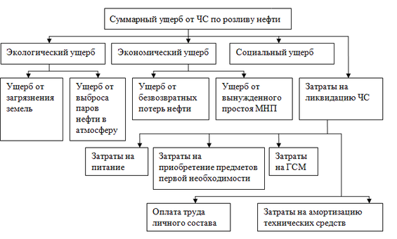 Возникновение ЧС при розливе нефти, повлечет за собой ущерб наносимый жизни людей, их здоровью, окружающей природной среде (далее ОПС), потери материальных ценностей и затраты на проведение аварийно-спасательных и других неотложных работ (далее АСДНР). Последствия ЧС имеют стоимостное выражение, характеризующее масштаб ЧС и воздействие опасности на людей, окружающую среду, материальные ценности.