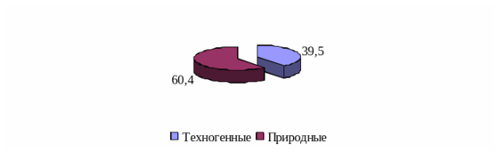 Число ЧС природного характера в соответствии с рисунком 1.2 в 1,5 раза превосходит число техногенных ЧС.