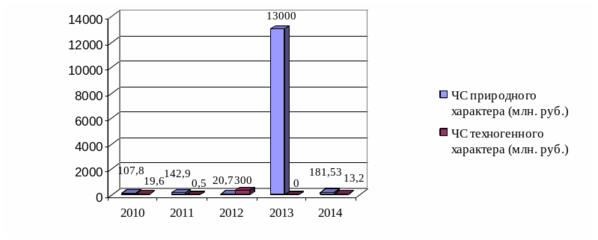В 2010 – 2014 годах на территории Хабаровского края зарегистрировано 43 чрезвычайные ситуации, из них природного характера 26 (60,4%), техногенного характера 17 (39,5%) от общего количества. В чрезвычайных ситуациях погибло 21 человек, пострадали 68 человек. Материальный ущерб составил 14382,23 млн. рублей. (приложение А, Б)